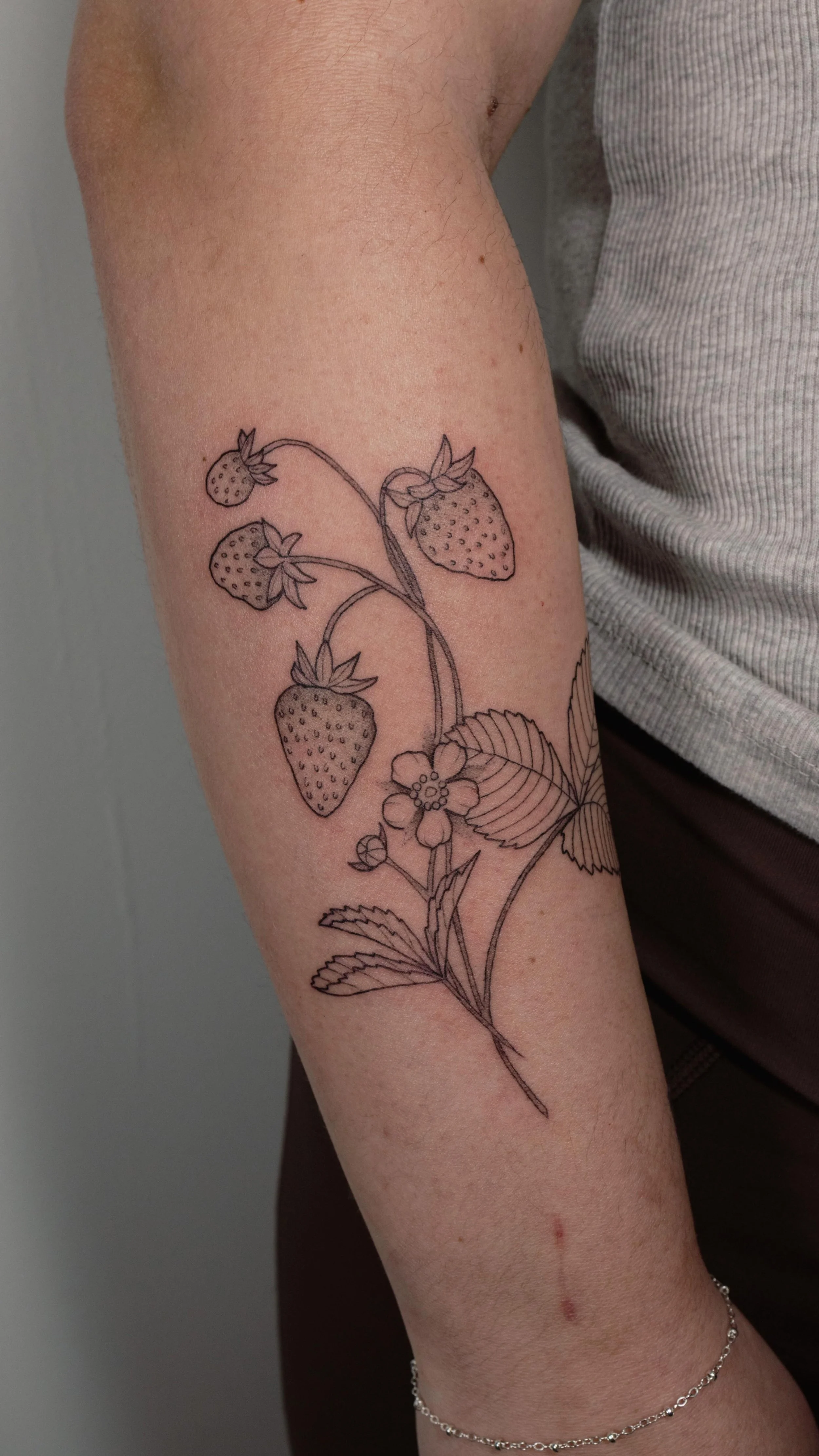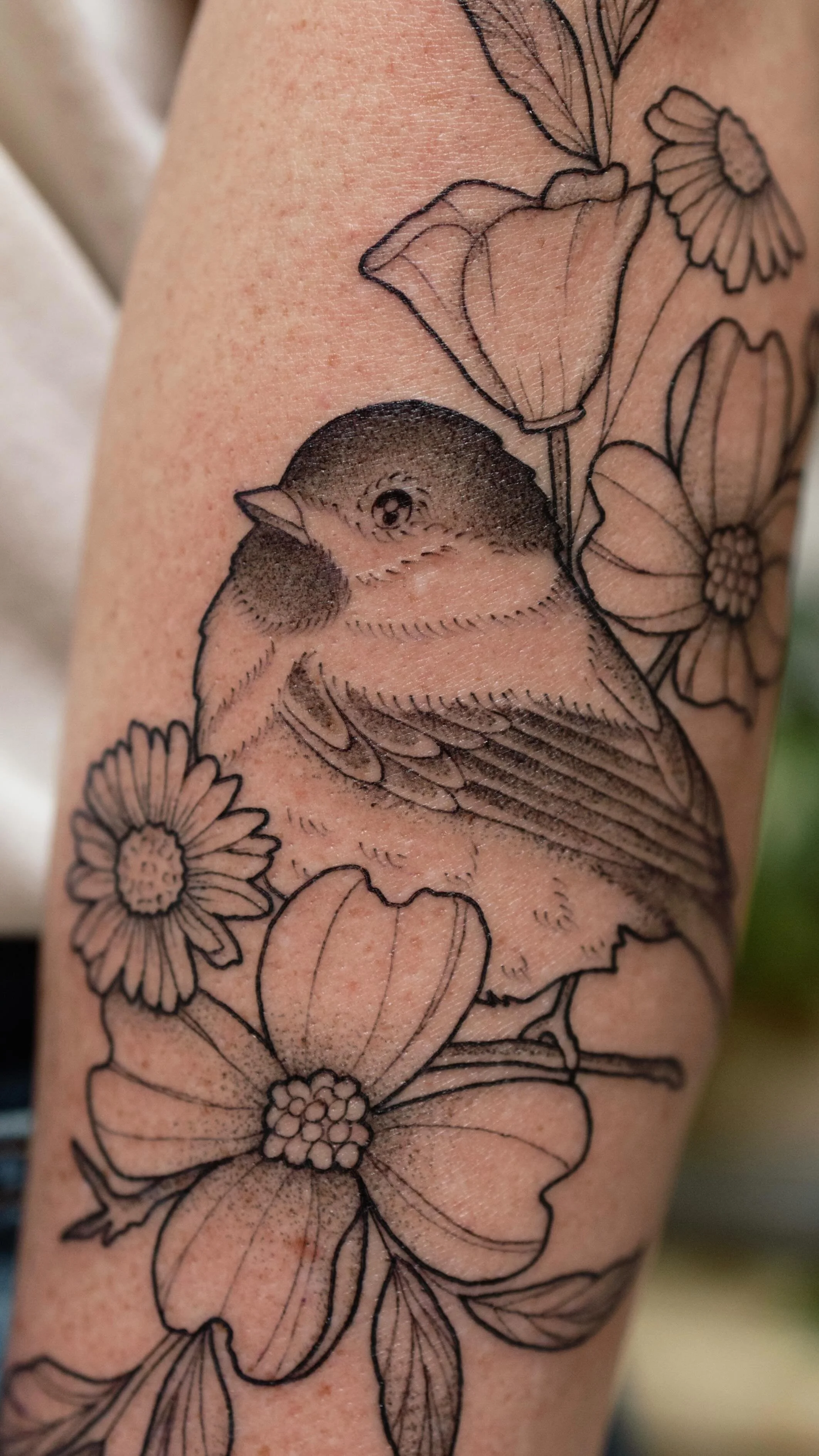 Jackie’s, Terra Tattoos, work is inspired by nature such as florals, birds, plants, bugs- anything you can find in the PNW. She specializes in black and grey illustrative art with an emphasis in line work, detail, dotwork, and stippling. Currently based in NE Portland,OR, she works out of The Nursery.